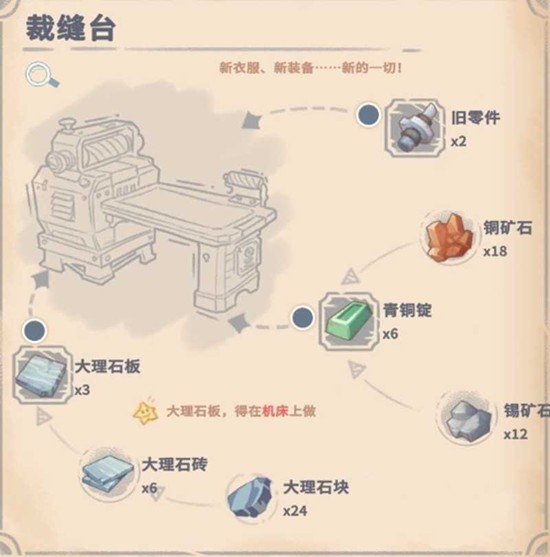 想要建造驼牛站,首先需要解锁并制作出前置工作台——裁缝台。裁缝台的制作材料包括2个旧零件、6个青铜锭和3个遗迹大理石板。旧零件和青铜锭在游戏前期通过探索和冶炼不难获得,而遗迹大理石板则需要深入遗迹探索,例如回收公司遗迹,击败其中的怪物或开启宝箱均有几率获得。