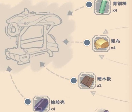 制作好裁缝台后,就可以准备驼牛站的核心材料了。驼牛站的建造需要4个青铜棒、4个粗布、2个硬木板以及4个遗迹橡胶壳。粗布需要在裁缝台上用植物纤维加工制成,植物纤维通过收割野外植物即可大量获取。青铜棒和硬木板则分别需要熔炉和中级加工台来制作。