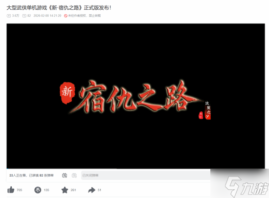 近日,大型武侠单机游戏《新·宿仇之路》官方放出了最新的正式版发布 PV,一起来看看吧!