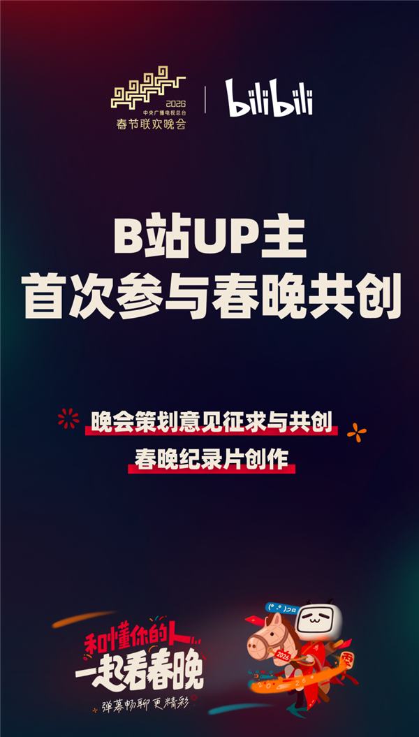 2月10日,中央广播电视总台《2026年春节联欢晚会》与春晚独家弹幕视频平台B站共同宣布:今年的春晚首次引入UP主参与。春晚导演组在晚会策划过程中广泛征求意见,B站UP主积极参与讨论。此外,UP主还参与了春晚纪录片的创作和拍摄,春晚后将在B站独家播出。