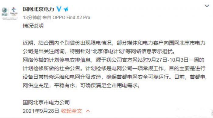 国家电网回应北京停电计划
