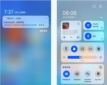 1、在鸿蒙系统中, 取消EMUI下拉打开菜单操作,将其改为左侧下拉打开通知中心,右侧下拉打开控制中心的操作;