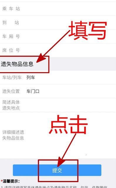 下滑页面,按要求填入遗失物品信息,之后点击页面下方的“提交”。