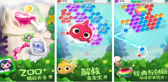 包含200余关卡,基础玩法为同色三连消除,延伸机制包括连锁反应、特殊泡泡生成及鱼宝宝救援目标。物理引擎模拟真实碰撞反馈,辅以磁铁、锤子等12类道具,降低随机性影响,增强策略可控性与通关成就感。