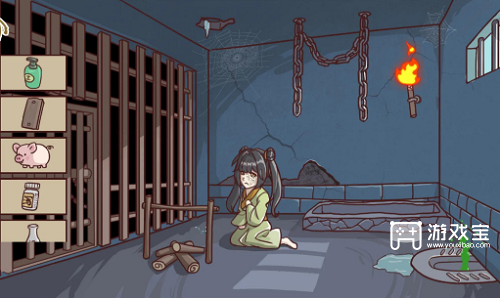 2、拖动火把把木材点燃把猪拖到火上烤,把烤猪拖给小乔,拖小乔到铁链锻炼变身金刚芭比,把信号枪拖给小乔,周郎来了墙太高上不去,用剪刀把小乔头发剪掉。