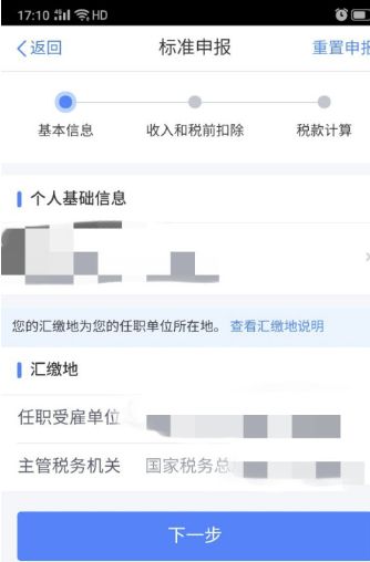 首先我们打开个人所得税的申报界面,确认个人基础信息无误后,点击“下一步”。