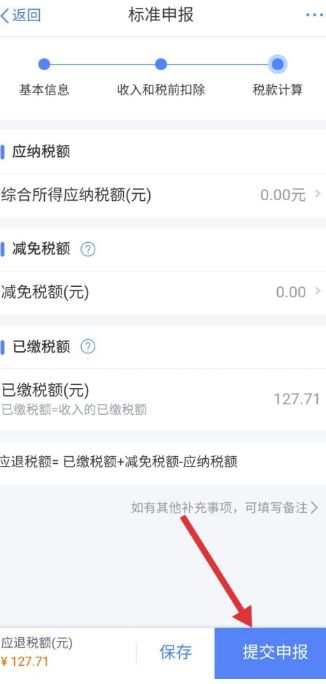 添加好后回到申报界面,点击“下一步”,我们可以看到有应退税额了,最后点击“提交申报”即可。