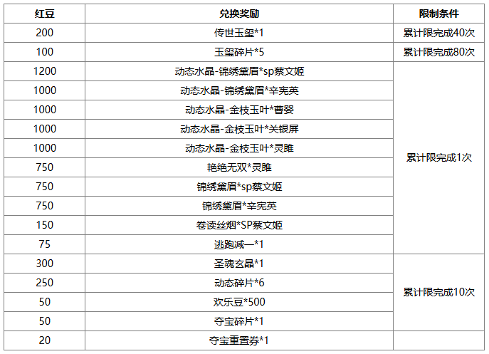 1、红豆可兑换奖励,若兑换奖励是在此次活动前已拥有的永久武将、皮肤、三国秀,则无法重复兑换;