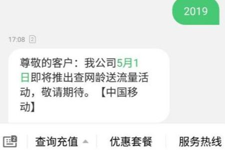 发送“2019”到10086 即可参加查“网龄”送流量活动