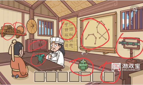 2、拖动酒杯泼到宁静-静静,点开柜子电池拖到香炉-星空顶,线拼成心形-貂蝉。