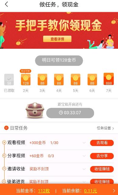 任务三,看视频赚金币,每天有三十次看视频赚金币的机会,就像你平时看新闻一样,一般每个视频观看30秒到1分钟左右,会有提示,每看一个视频有十个金币。