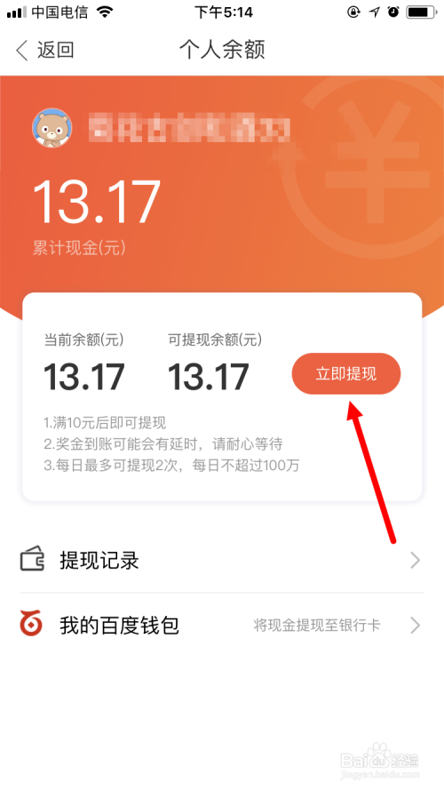 进入 个人余额 页面后,继续点击 立即提现(余额满10元后才可以提现) 。