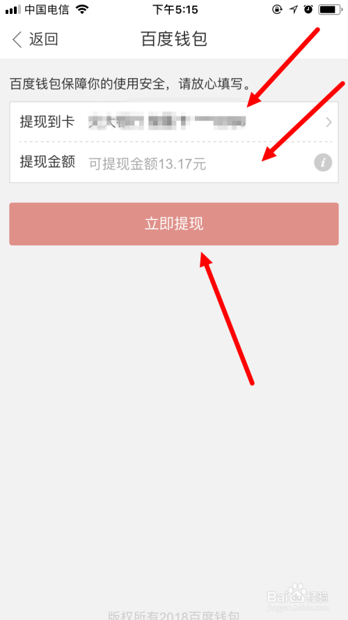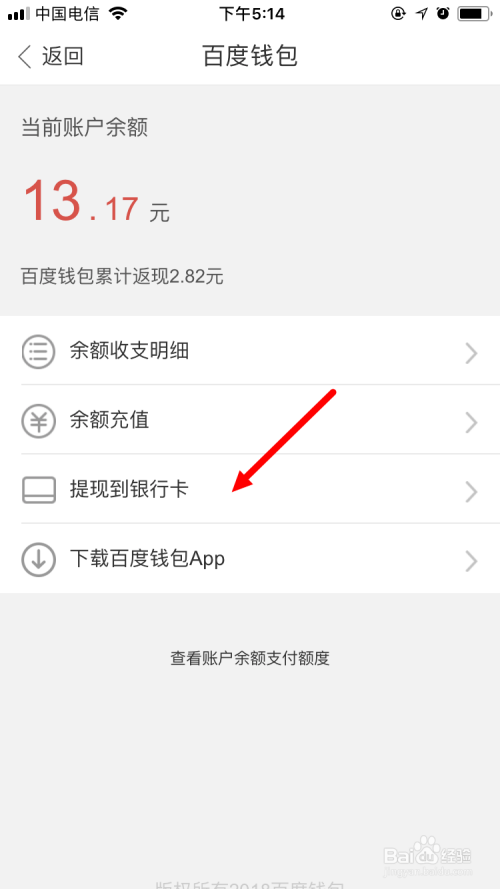 此时,系统会自动跳转到百度钱包,在下图的页面中点击 提现到银行卡 。