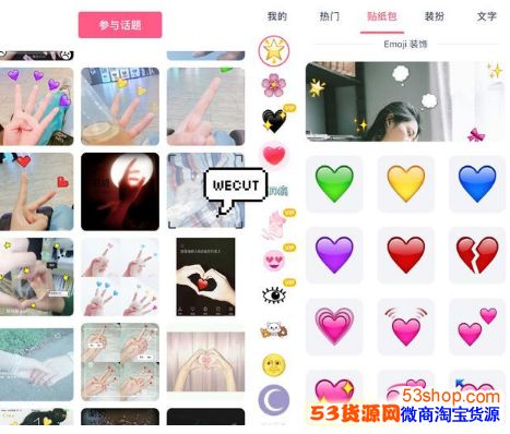 方法1:打开wecut - 图片编辑 - 添加贴纸 - 选择emoji/爱心分类贴纸