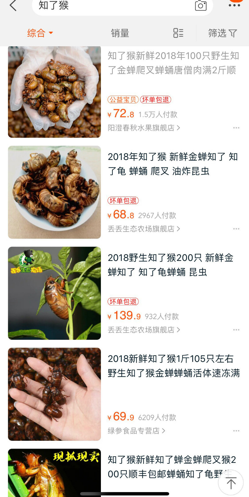 其中一家来自河北的商家阳澄春秋水果天猫旗舰店,销售就占到了整体知了销售的一半,一个月卖出了500多万只知了猴。