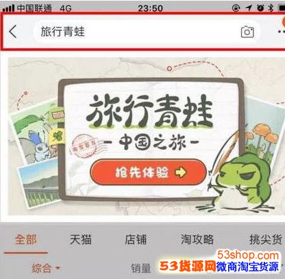 1、在淘宝搜索栏搜索“旅行青蛙”关键词,就会出现游戏页面让你点击进入了。