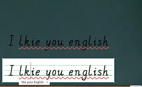 2、小编分别添加了文本框、四线三格,可以看到当英语语法错误时,它将会以下划线的方式进行提示,点击波浪线即可显示正确拼音,