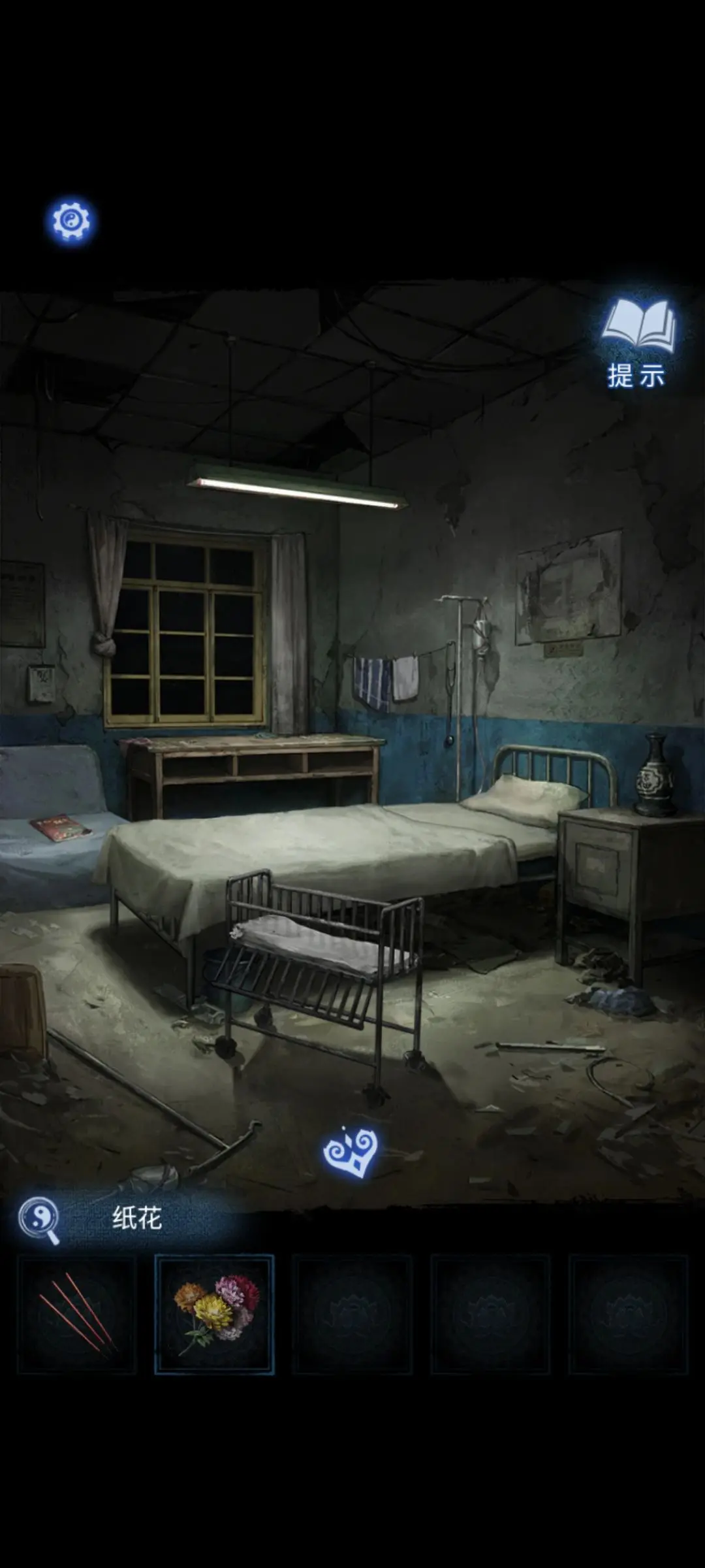 13:点击窗台旁,桌上的报纸触发动画,动画结束后在推车上获得花,将花插病床旁的花瓶,触发动画。动画结束后获得笔和墨盒