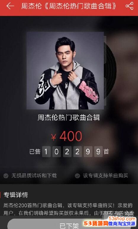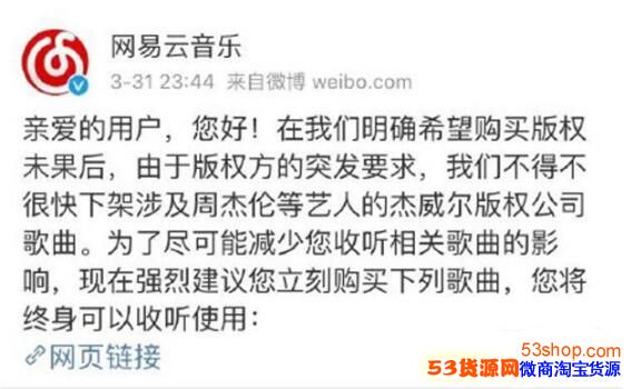 昨天晚上,网易云音乐突然发布公告,称因版权方要求,不得不很快下架了涉及周杰伦等艺人的杰威尔版权公司歌曲。并且网易云音乐还顺便推出了购买周杰伦200首热门歌曲合辑的链接,售价400元,不过目前该专辑购买已下架。