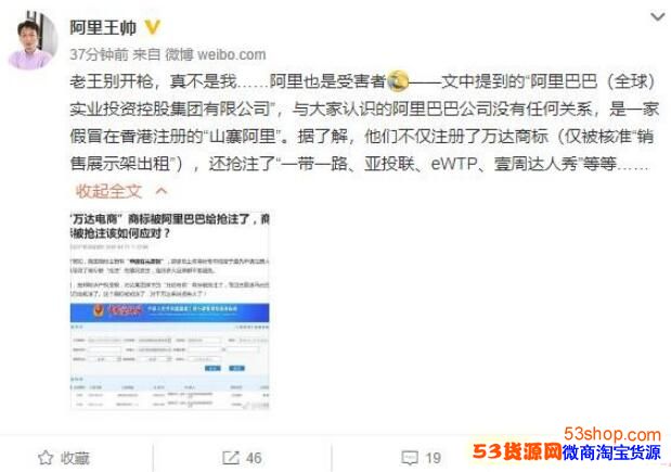 老王别开枪,真不是我……阿里也是受害者——文中提到的“阿里巴巴(全球)实业投资控股集团有限公司”,与大家认识的阿里巴巴公司没有任何关系,是一家假冒在香港注册的“山寨阿里”。据了解,他们不仅注册了万达商标(仅被核准“销售展示架出租”),还抢注了“一带一路、亚投联、eWTP、壹周达人秀”等等……