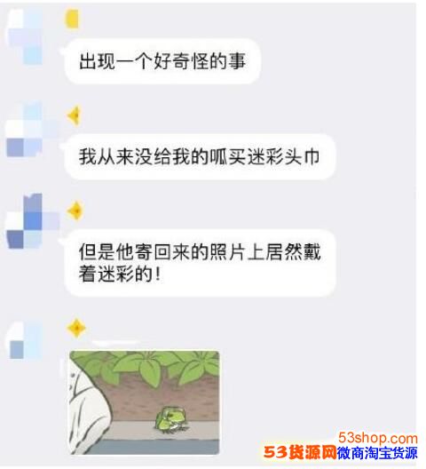 这名网友称自己发现了一个很奇怪的事情,自己明明没有给蛙买过迷彩头巾,但是出去以后发回来的照片头上却带着 头巾,这个究竟是谁买的!