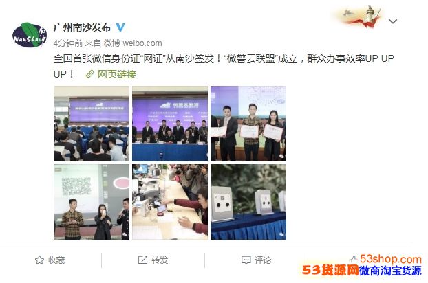由广州市公安局南沙区分局、腾讯、建设银行等10余家单位发起的“微警云联盟”在广州南沙成立,并且现场签发全国首张微信身份证“网证”。