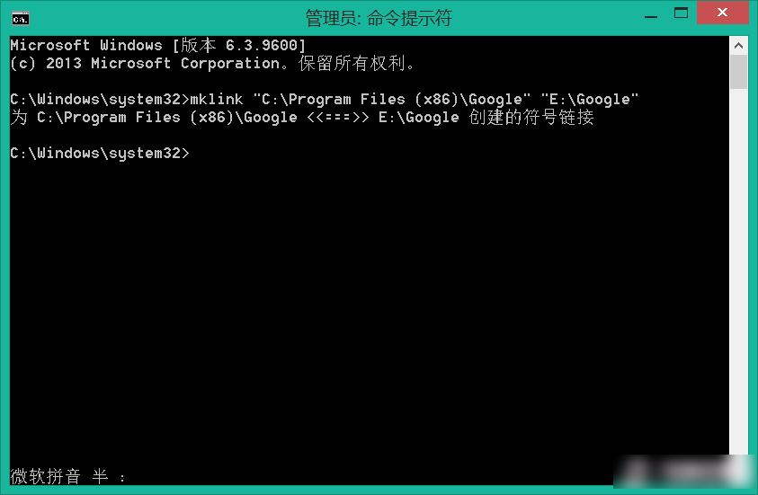 以管理员打开命令提示符,输入mklink "C:Program Files (x86)Google" "E:Google"(前面引号里是默认安装位置,后面为移动之后位置,注意空格)。