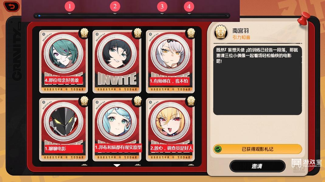 活动一共10个角色可以邀约看电影,每次邀约都会出个4个节点供你进行选择。