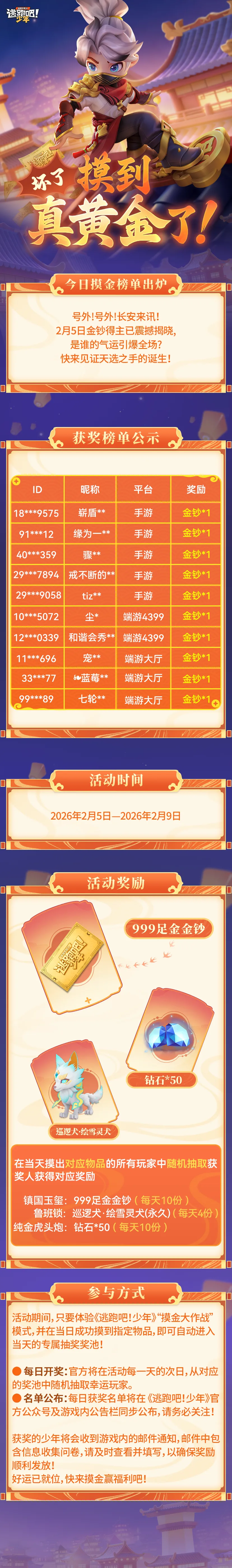 《逃跑吧!少年》2月5日起赢999足金金钞!