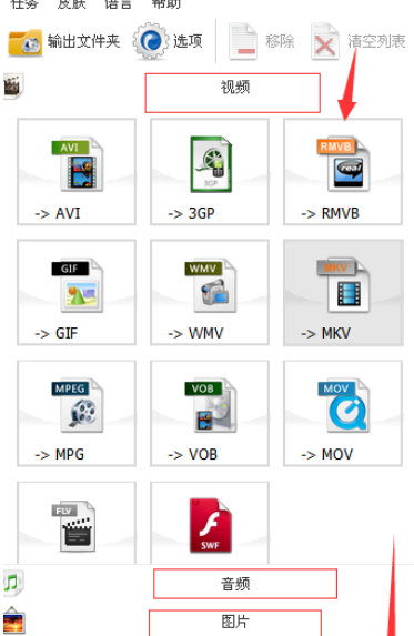 然后我们进入格式工厂主界面,看到下面有很多选择,比如图片,音频,视频等等的设置选择。