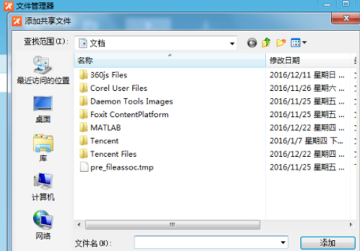 然后我们点开左侧的添加共享, 也就说把你需要共享的文件添加到里面
