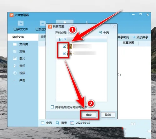 6.设置共享范围:最后,在“共享范围”窗口中,选择可以访问此共享文件的用户(勾选相应的权限),点击“确定”。至此,文件就会在局域网中被共享。