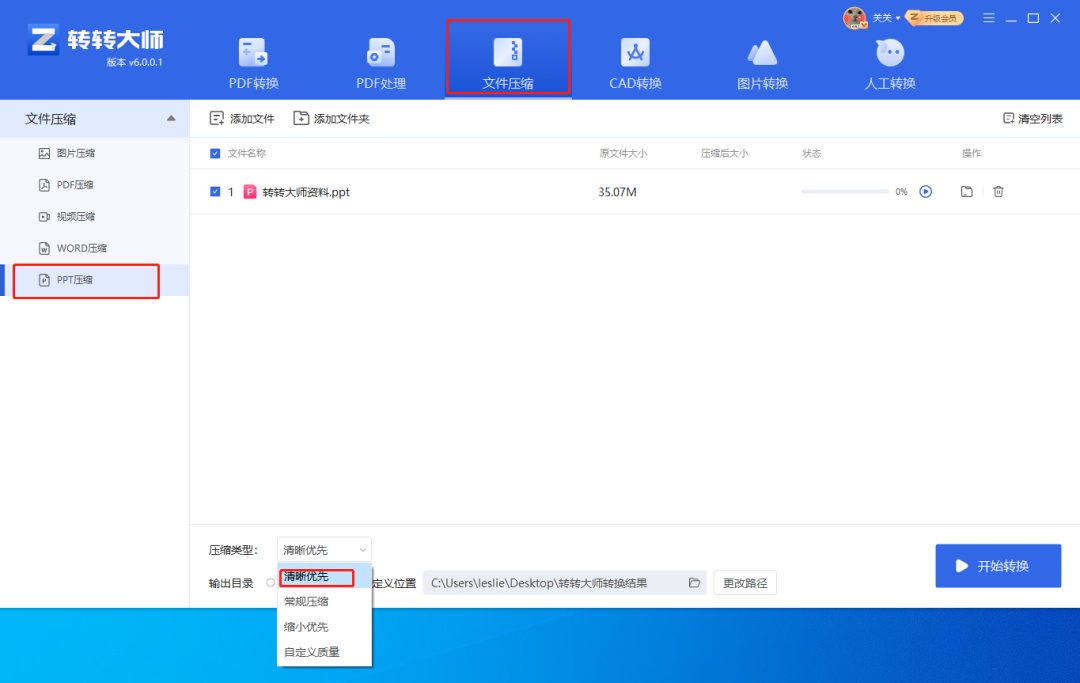 3.选择压缩设置:在软件中,根据您的具体需求,选择一个合适的压缩级别。例如,如果您更重视文件质量,可以选择"清晰优先";如果您希望尽可能减小文件大小,可以选择"缩小优先"。选择完毕后,点击"开始转换"以启动压缩过程。