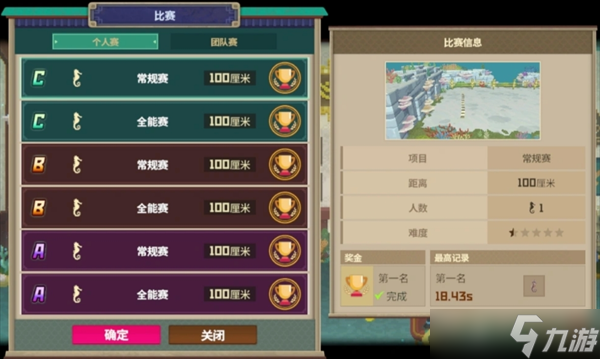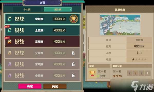 分为个人赛和团队赛,其中常规赛为单纯比拼速度,全能赛为设置障碍物的同时要求速度