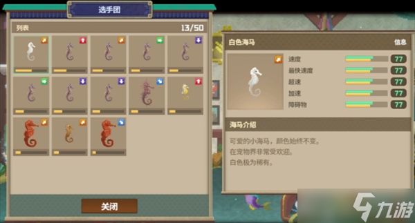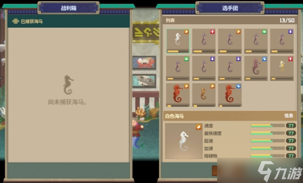 每次下海捕捉的海马选择放入装载箱可以到这里加入选手团,不要的海马也可以在管理中释放