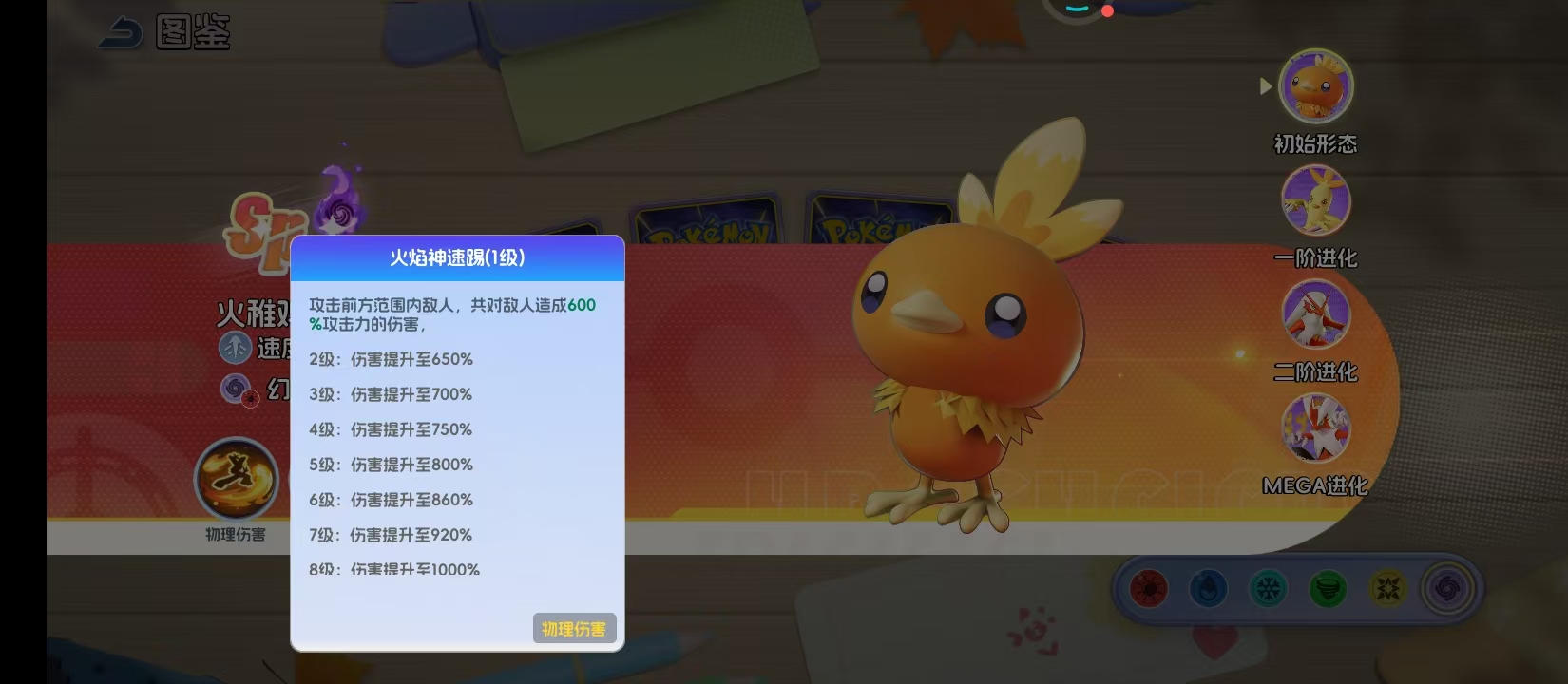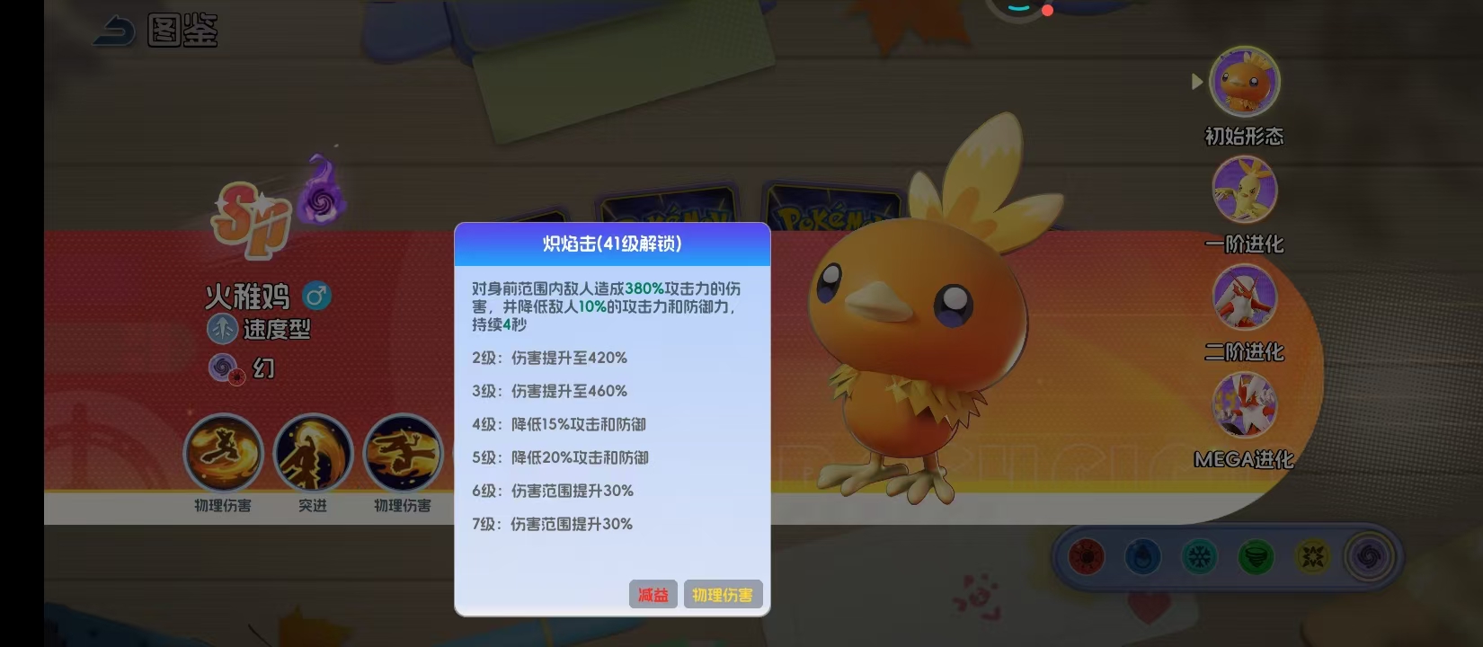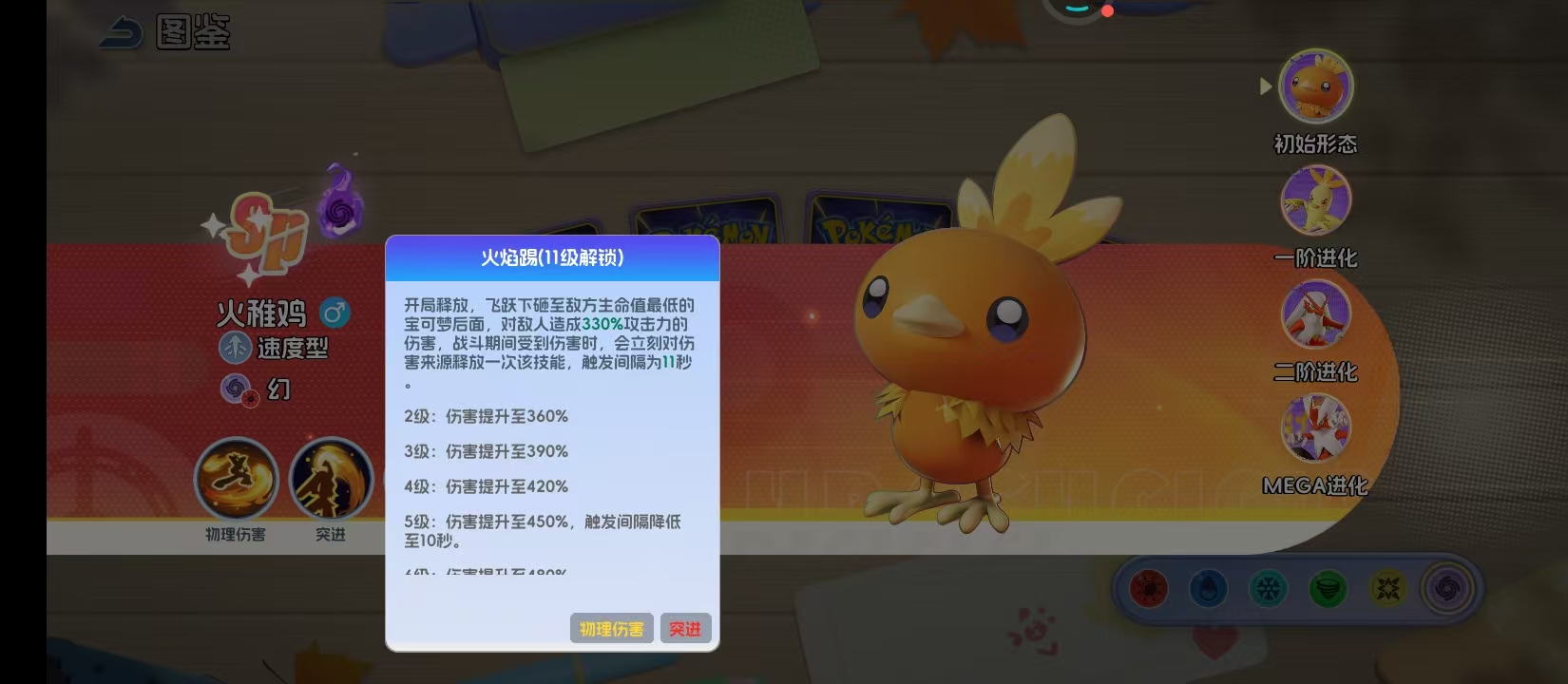 火焰踢这是等级11级之后就可以解锁的技能,核心的机制就在于拥有针对性。在开局释放时,他就直接会跳到敌方生命值最低的宝可梦身后,就可以造成330%的攻击力伤害,这种精准的斩杀设计就可以让他直接成为敌方后排的噩梦。战斗期间如果他受到伤害,那就会对伤害来源直接释放一次技能,触发间隔初始是11秒伴随着技能等级提升就可以直接缩短到10秒。这一个机制在对手集火攻击时,那自然就会有效果。