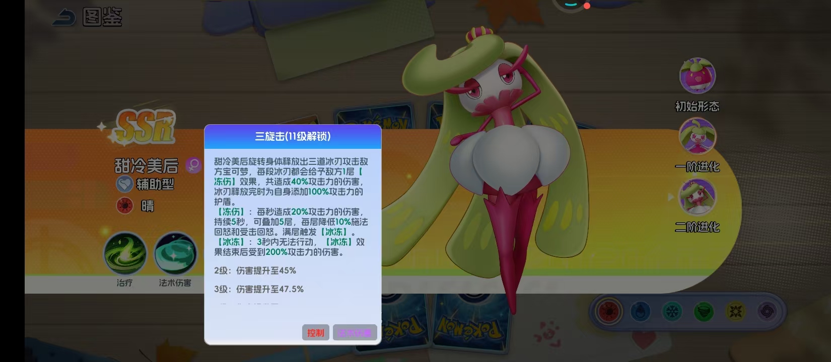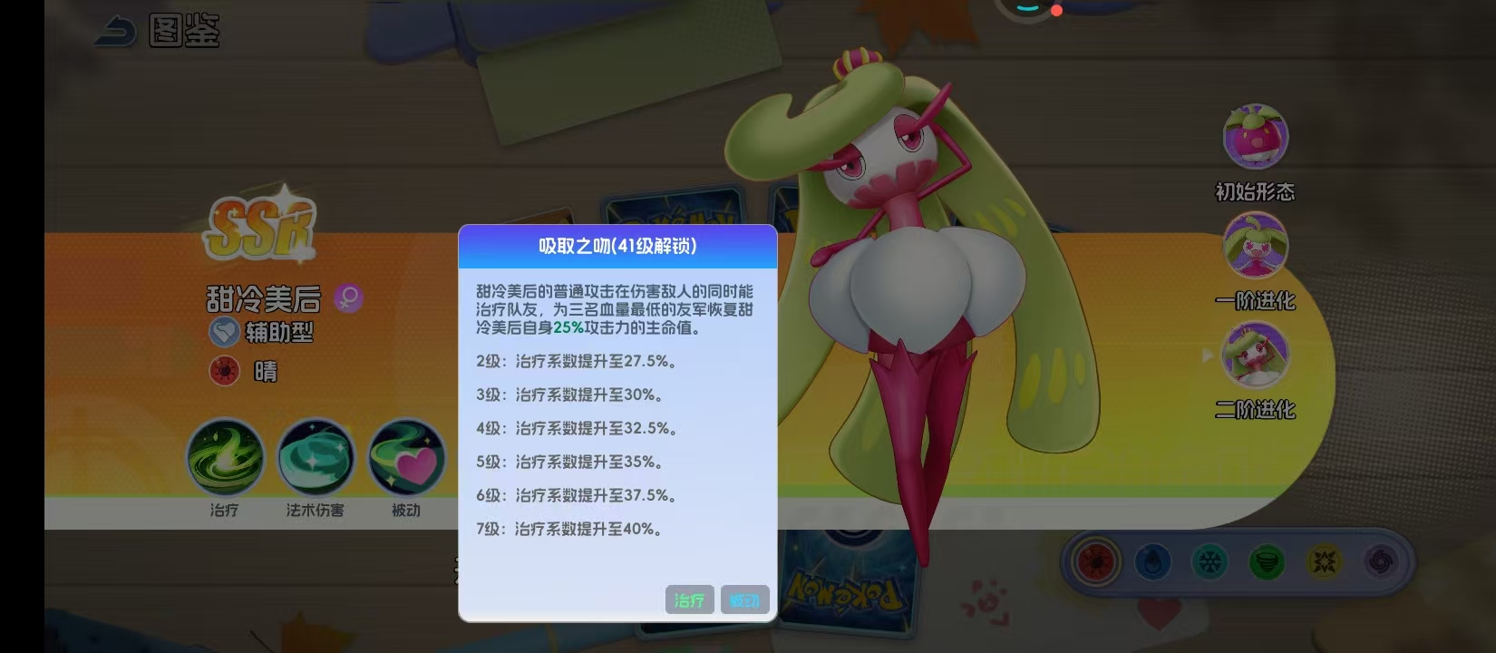 甜冷美后的核心技能是青草场地,这就是作为团队核心的证明,这一个技能可以让全体的队友在一瞬间恢复10%的最大生命值,还能持续提供自身攻击力的治疗,有效降低敌方全体6%的怒气回复速度。这一个技能还是很有优势性的,也就意味着在对战的过程中,它并不是只是单纯性的治疗手段,可以压制敌方的怒气循环,然后创造出更多的战术优势。在PVP的战场上,一个满级的青草场地,就可以直接打乱敌方的输出节奏。