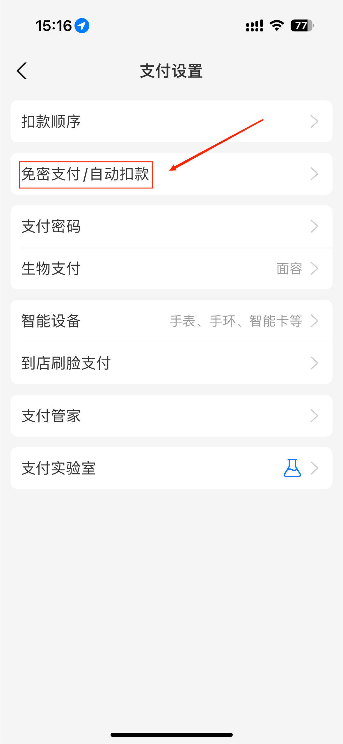 ②在设置页面中,选择「支付设置」,找到「免密支付/自动扣款」部分。