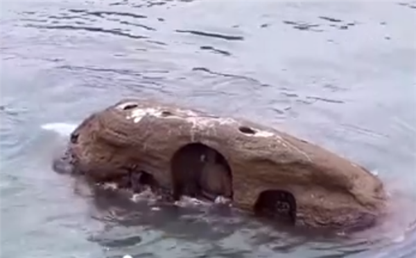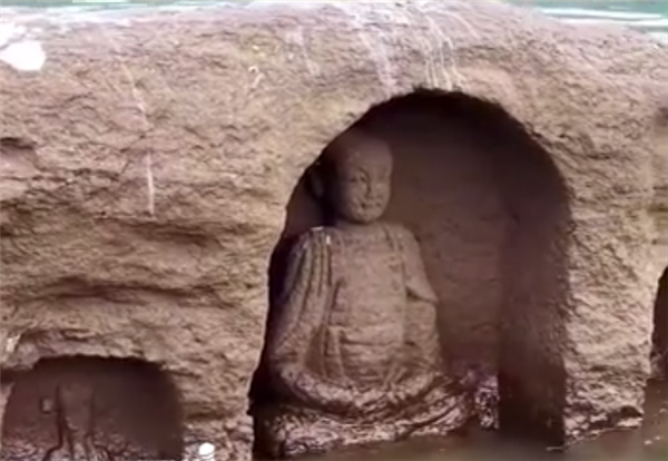 该佛像位于重庆某江心岛区域,属于明代文物遗存,长期被江水淹没,仅在枯水期偶露部分真容。