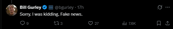 随着事件发酵,Bill Gurley最终公开道歉,表示此前言论只是玩笑,并非真实消息,属于假新闻。