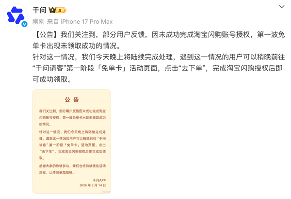 千问表示,遇到这一情况的用户稍晚可前往活动页面,点击“去下单”,按照提示完成淘宝闪购授权,即可成功领取免单卡。