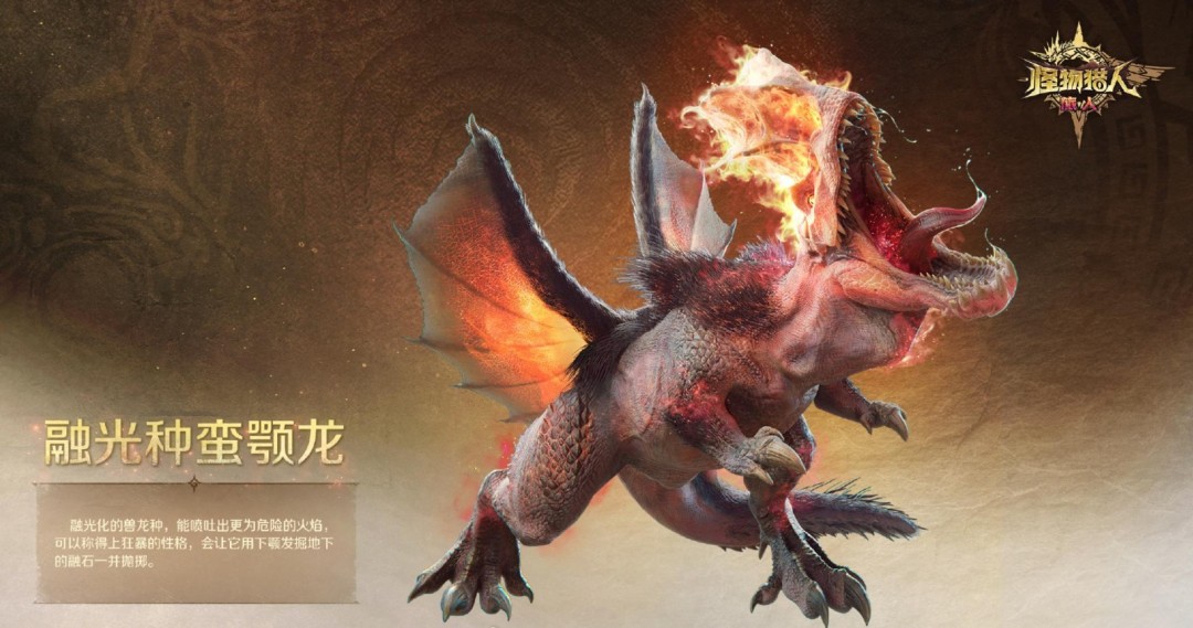 融光种蛮颚龙:融光化的兽龙种,能喷吐出更为危险的火焰,可以称得上狂暴的性格,会让它用下颚发掘地下的融石一井抛掷。