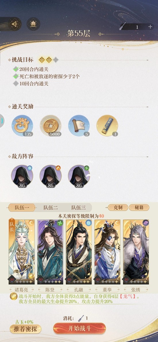 按道理说,这个关全队都可以换,但是输出一定要够,还有就是要计算黑衣人每回合的能量。我就是输出不够只能持久战了,诸葛亮也不一定dot主要是沟通我伤害不够……