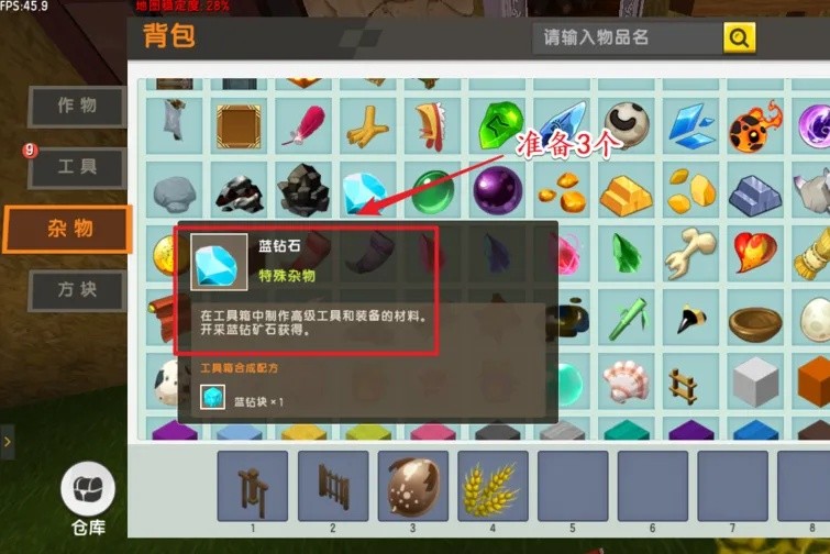 到地底下挖3个蓝钻石矿石,且使用熔炼炉将其烧制为3个蓝钻石材料。