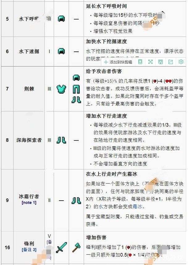 ⑫锋利等级Ⅰ-Ⅴ可以增加武器的伤害。剑可以通过附魔台获得此魔咒,斧头可以通过铁砧与附魔书得到~