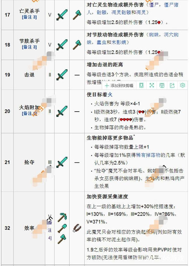 ⑬亡灵杀手等级Ⅰ-Ⅴ亡灵生物包括僵尸、僵尸猪人、骷髅、凋灵骷髅和凋灵。亡灵杀手的魔咒攻击这些生物时,还可以产生额外的伤害。剑可以通过附魔台获得此魔咒,斧头可以通过铁砧与附魔书得到~