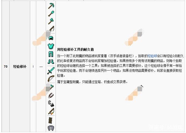 ②经验修补等级Ⅰ经验修补与耐久度有关,是用经验换耐久度的方式,增大物品的寿命。这个魔咒属于宝藏型附魔,只能通过宝藏或者钓鱼获得哦~