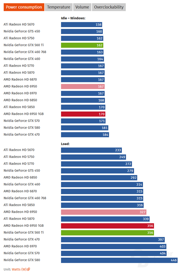 HD 6950的功耗水平和560 Ti基本在同一档次,都是350W左右,还是相当完美的,毕竟芯片面积大得多。
