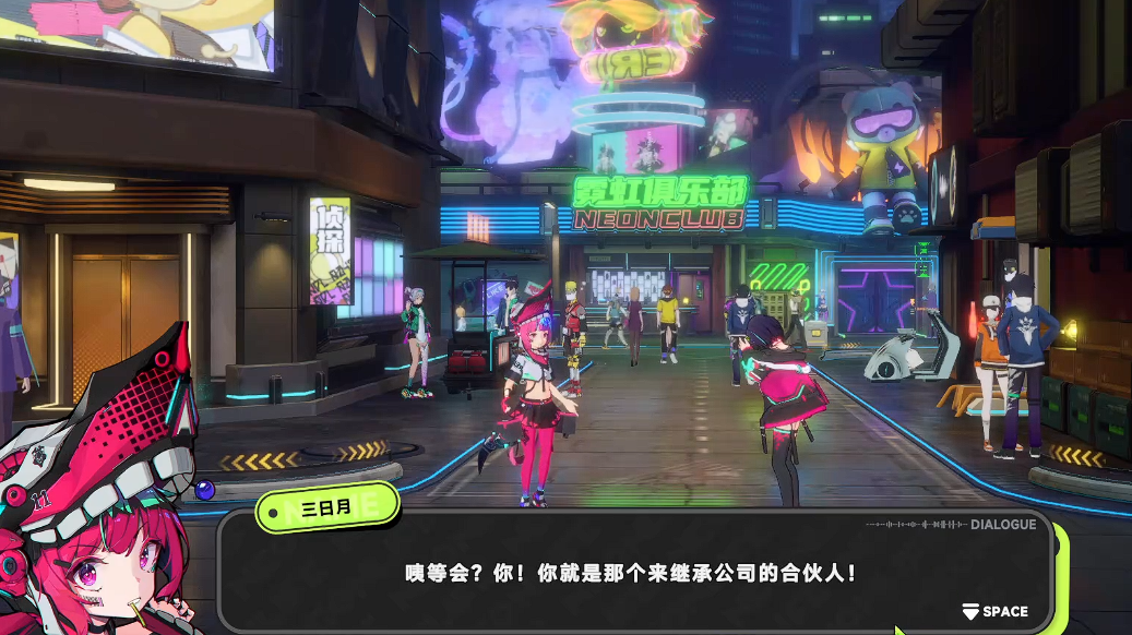 游戏主线不依赖强冲突或宏大设定,而是聚焦于细腻的人物关系与城市生态:玩家扮演一位继承多家产业的公司合伙人,在初入霓虹市时收到一条神秘讯息,由此开启探索之旅。首站即遇关键角色三日月——她不仅是引导玩家熟悉环境的向导,更是贯穿早期剧情的重要NPC,性格明快、观察敏锐,其对话自然带出主角背景与城市基本规则。