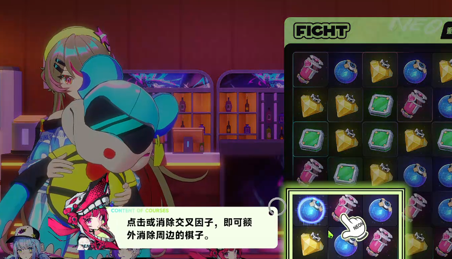 在三日月带领下,玩家逐步解锁霓虹市核心区域,首处落脚点为“俱乐部”——此处既是社交枢纽,也是玩法教学中心。俱乐部内设有高频出现的消除类小游戏,玩家通过精准操作完成方块消除挑战,积累分数以赢得信任值;达成目标后可承接合作任务,持续提升声望与本地影响力,为后续拓展个人势力范围奠定基础。